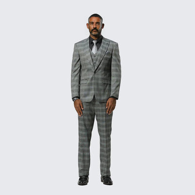 View full detailsMens grey skinny fit three piece suit with peak lapel. High end suit by Stacy Adams. Glen Check design. This suit is made of a luxurious rayon visc...