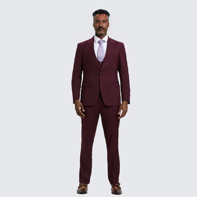 View full detailsThis men's burgundy slim fit three piece suit with large peak lapel is a sophisticated addition to your wardrobe. This slim cut suit is made of a l...