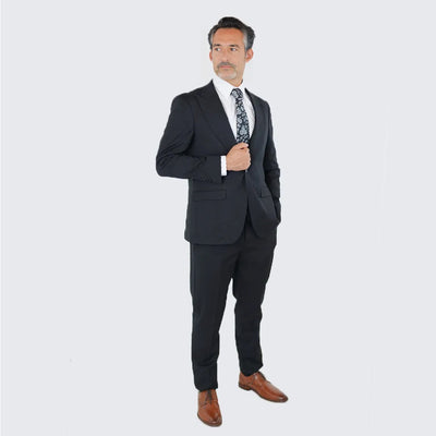 View full detailsThis men's black slim fit three piece suit with large peak lapel is a sophisticated addition to your wardrobe. This slim cut suit is made of a luxu...