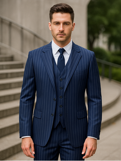 View full detailsThis men's navy blue slim fit three piece suit with large peak lapel is a sophisticated addition to your wardrobe. This slim cut suit is made of a ...