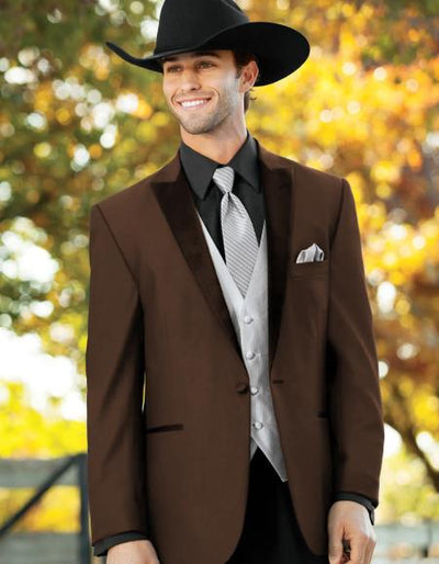 This men's slim fit wedding suit from Tazzio Suits in a rich brown offers a contemporary take on formalwear. Made with a sharp, solid fabric, it bo...