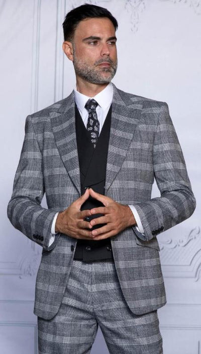 2 Button Peak Lapel Single Breasted Windowpane Pattern Double Breasted Vest One Chest Pocket Two Flap Front Pocket Color: Gray