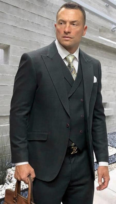 View full detailsThis designer wool fashion suit features a 1 button closure, wide peak lapel, double breasted green vest, and matching pants, in a hunter green wi...