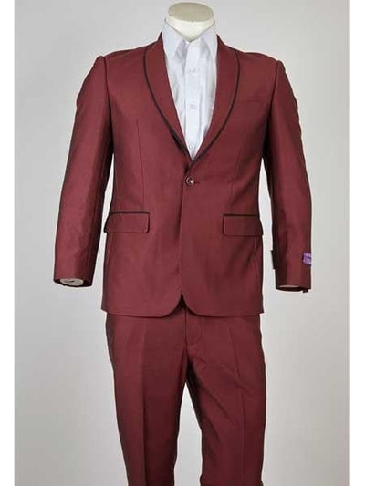 View full detailsOne Button Slim Fit Tuxedo Shawl Satin Trim Lapel Color: Burgundy Maroon SKU#VIN-SSH-1