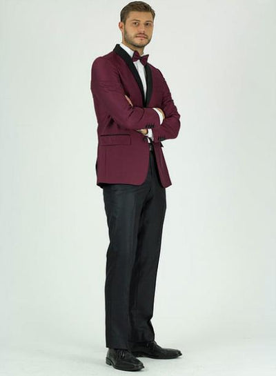 View full detailsButtons Closure Classic Fit Jacket Shawl Lapel Side Vents One Chest Pocket Flap Front Pockets Matching Bow Tie Color: Burgundy