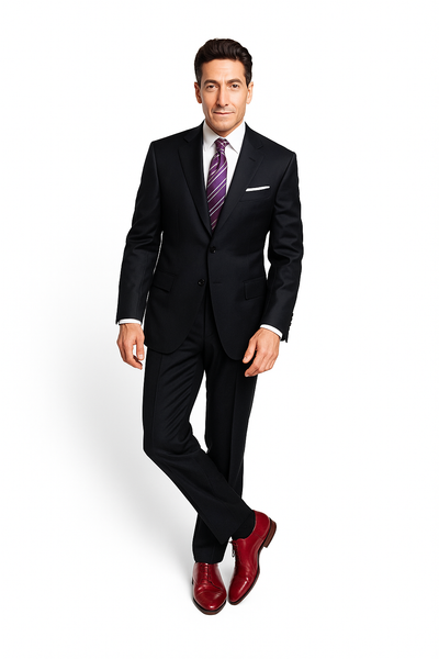 View full details100% Super 100's Wool 2 Button Front Notched Lapel Classic Full Cut Fit Dual Back Vents Full Lining Interior Pick Stitch Detail Flap Over Front Hi...