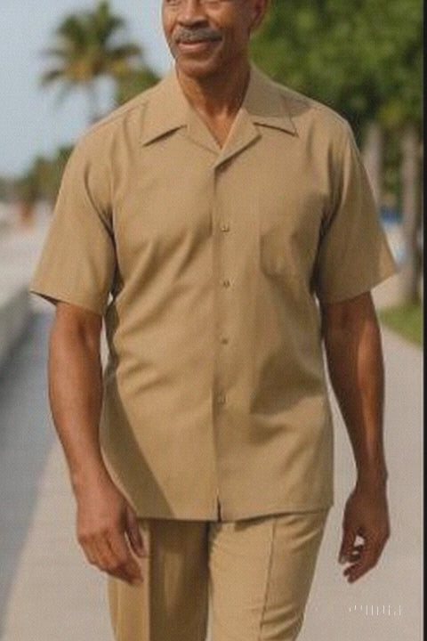 5 Buttons Short Sleeve Tan Casual Two Piece Walking Outfit For Sale Pant Sets Shirt With Pant Set