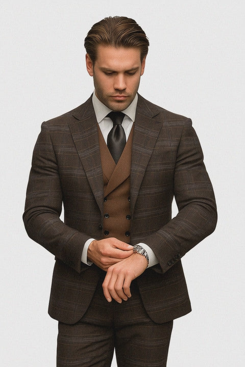 Athletic Suit - Brown Windowpane - Plaid Suit Modern Fit Side Vented Super 150's Wool Fabric