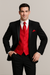 Make a powerful style statement with this men's formal combo featuring a sleek black 2-button, single-breasted suit with sharp peak lapels, paired with a classic black shirt and a vibrant red vest and tie. Designed for modern sophistication, this combination exudes confidence and elegance—perfect for weddings, formal events, or any occasion where standing out is a must. The rich color contrast and tailored fit create a bold yet refined look that commands attention effortlessly.