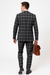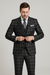 The striking black fabric serves as a bold backdrop for the windowpane pattern, a design that has long been celebrated for its clean lines and distinctive style. The subtle yet prominent check pattern adds depth and character without overwhelming the look, making it both versatile and sophisticated. The jacket is tailored with a structured fit that emphasizes the shoulders and chest while tapering neatly at the waist, creating a sharp silhouette that conveys authority and confidence. A matching vest completes the three-piece ensemble, offering both layering versatility and an extra touch of refinement, especially when worn with the jacket unbuttoned. The coordinating trousers maintain the streamlined look, with a fit that balances comfort and polish, ensuring you appear effortlessly well-dressed.