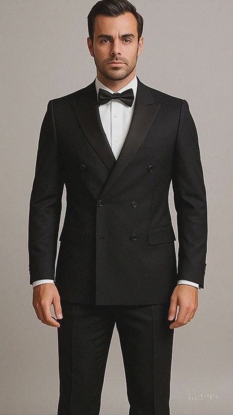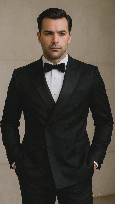 This black double-breasted tuxedo redefines formalwear by combining heritage tailoring with a sleek modern fit. Its satin detailing, refined pockets, and slim silhouette make it a must-have in every gentleman’s wardrobe. Whether you’re walking down the aisle, attending a gala, or dressing for a black-tie dinner, this tuxedo delivers confidence, sophistication, and timeless appeal.