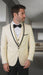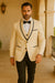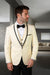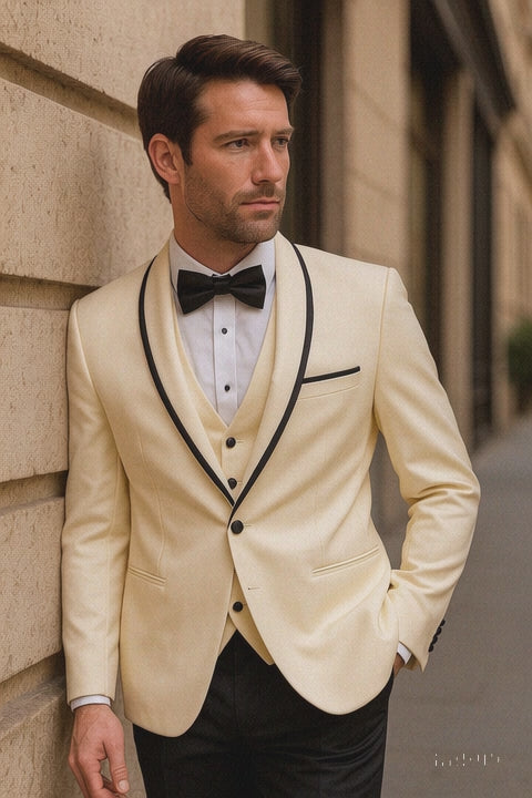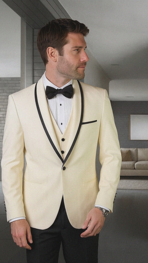 Keywords: mens ivory and black tuxedo, ivory shawl lapel tuxedo, vested wool tuxedo with satin trim, three-piece ivory tuxedo, wedding tuxedo for groom, slim fit ivory tuxedo, luxury ivory tuxedo for men, black tie ivory suit
