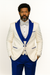 White paisley fancy fabric with royal blue satin lapel, creating a powerful high-contrast look.