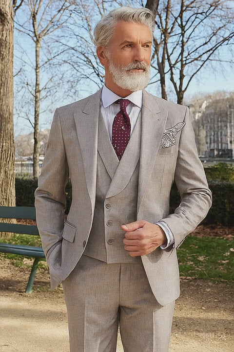 Wear the full three-piece suit with a crisp white or light blue dress shirt and a solid or subtly patterned tie for business settings. For a more formal event, swap in a dark or jewel-toned shirt and coordinating pocket square. The peak lapel jacket can also be worn as a separate with solid charcoal or navy trousers for smart casual or creative business environments.