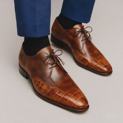 Material Excellence: Crafted with genuine Orix brown calfskin leather paired with striking alligator-embossed detailing, this Derby brings rich texture and dynamic color contrast.