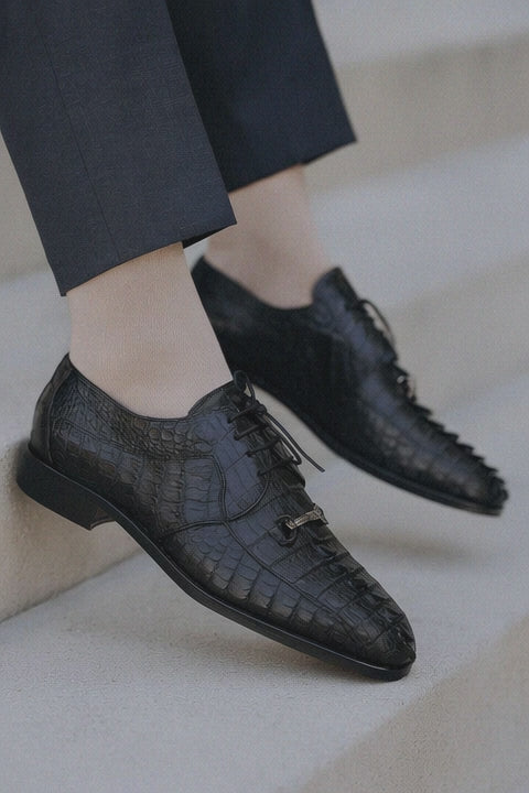 From boardrooms to black-tie affairs, the Cancun Black Caiman Derby is your go-to footwear for commanding presence. Pair it with a tailored tuxedo, sleek charcoal suit, or upscale casual attire—its versatile yet bold aesthetic delivers style and sophistication in equal measure.