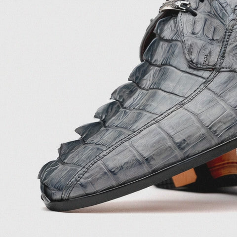 Crafted from genuine Caiman crocodile leather, each pair features a unique scale pattern that ensures no two shoes are ever alike. The luxurious gray hue is hand-dyed for depth and richness, delivering a sleek, contemporary finish that complements both formalwear and upscale casual ensembles.