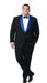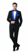 - Classic black tuxedo with a modern royal blue shawl lapel