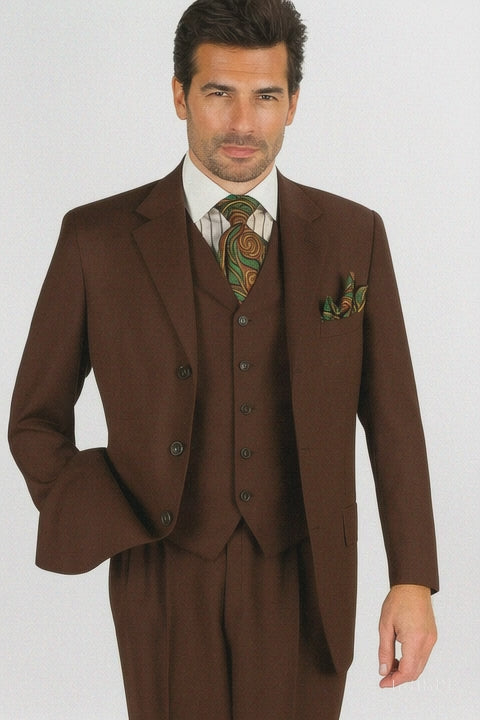 Mens Classic Fit 3 Button Vested Single Pleated Pant Suit in Chocolate Brown