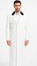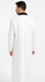 This is a classic long white overcoat designed for elegance and sharp sophistication. Crafted from a smooth, structured fabric, the coat features a single-breasted front with three cleanly aligned buttons, giving it a refined and timeless silhouette. The design includes two slanted side pockets, ideal for both style and functionality. The most distinctive element is the black velvet collar, adding a bold contrast that elevates the coat’s luxurious appearance.