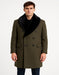 Mens Olive Green Wool Overcoat with Black Faux Fur Shawl Collar – Double Breasted Winter Coat