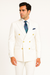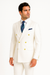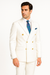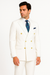 The jacket showcases peak lapels, a double-breasted six-button front, and luxurious gold-tone buttons, adding a regal touch to the classic white ensemble. Designed with flap pockets and a slim silhouette, the suit offers a flawless fit and a high-impact finish.