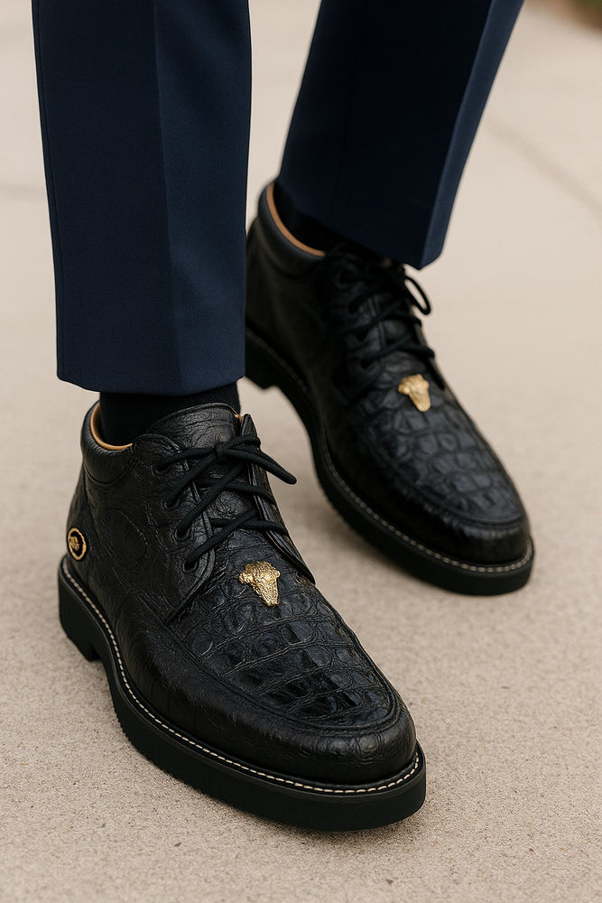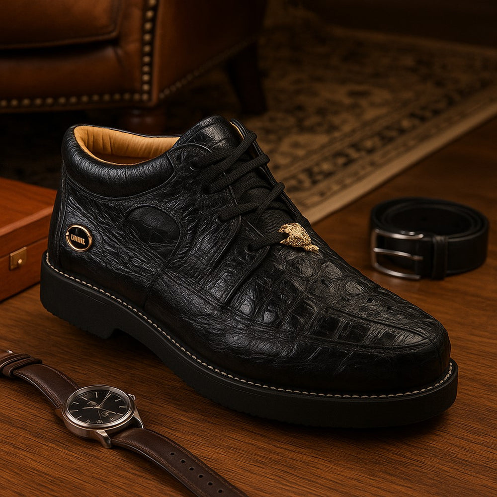 Step into rugged sophistication with the Men's Wild West Boots Caiman and Ostrich Skin Shoe, a luxurious fusion of exotic leather craftsmanship and frontier-inspired design. Handcrafted for the discerning gentleman, this premium footwear blends the bold textures of genuine caiman belly skin and ostrich quill leather—delivering unmatched durability, style, and heritage.