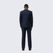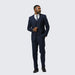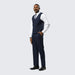 Mens navy blue skinny fit three piece suit with peak lapel. High end suit by Stacy Adams. Plaid design. This suit is made of a luxurious rayon viscose/ dacron blend fabric that looks and feels like super 100 wool. Coat has two button front closure with notch lapel. Jacket has two front flap pockets and one chest pocket. Jacket pockets are usable but come sewn shut. Gently cut open to use. Tetron silk lining. Very high quality and well constructed. Comes with matching plain-front tapered trousers with narrow leg opening. Pants come unfinished at the bottom so that you can hem at your proper length .Comes with a matching four button fullback vest. Also, a bonus pocket square included. Dry clean only. This suit is a hybrid fit, meaning, sizes up to 44 are a slimmer cut and sizes 46+ are modern fit.