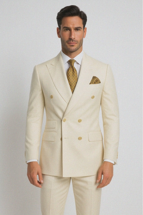 Make a lasting impression with this double breasted peaked lapel suit in a refined off white / ivory / cream tone. Designed for elegance and versatility, this suit is perfect for proms, weddings, formal events, and special occasions, offering a sharp, distinguished look that stands out in any setting.