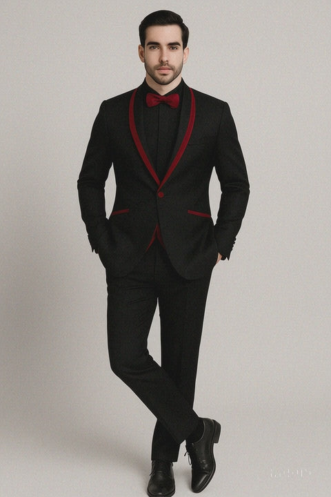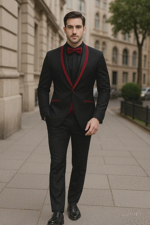 Prom 2025 ~ Wedding Tuxedo Dinner Jacket Black/Burgundy Trim