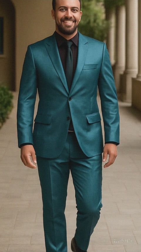 I wore this shiny teal suit to a charity gala and got more compliments than I ever expected. The color stands out under the lights, and it feels luxurious without being too flashy. Easily my favorite formalwear purchase.