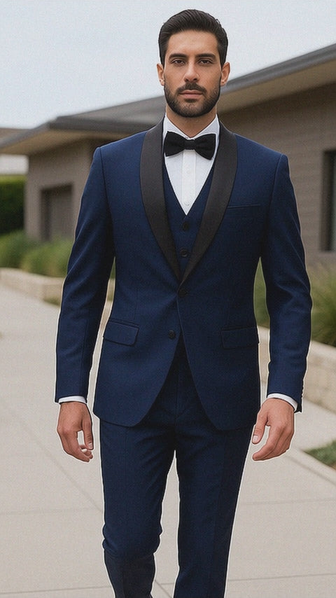 Mens Wool One Button Modern Fit Vested Shawl Prom Tuxedo in Sapphire Blue